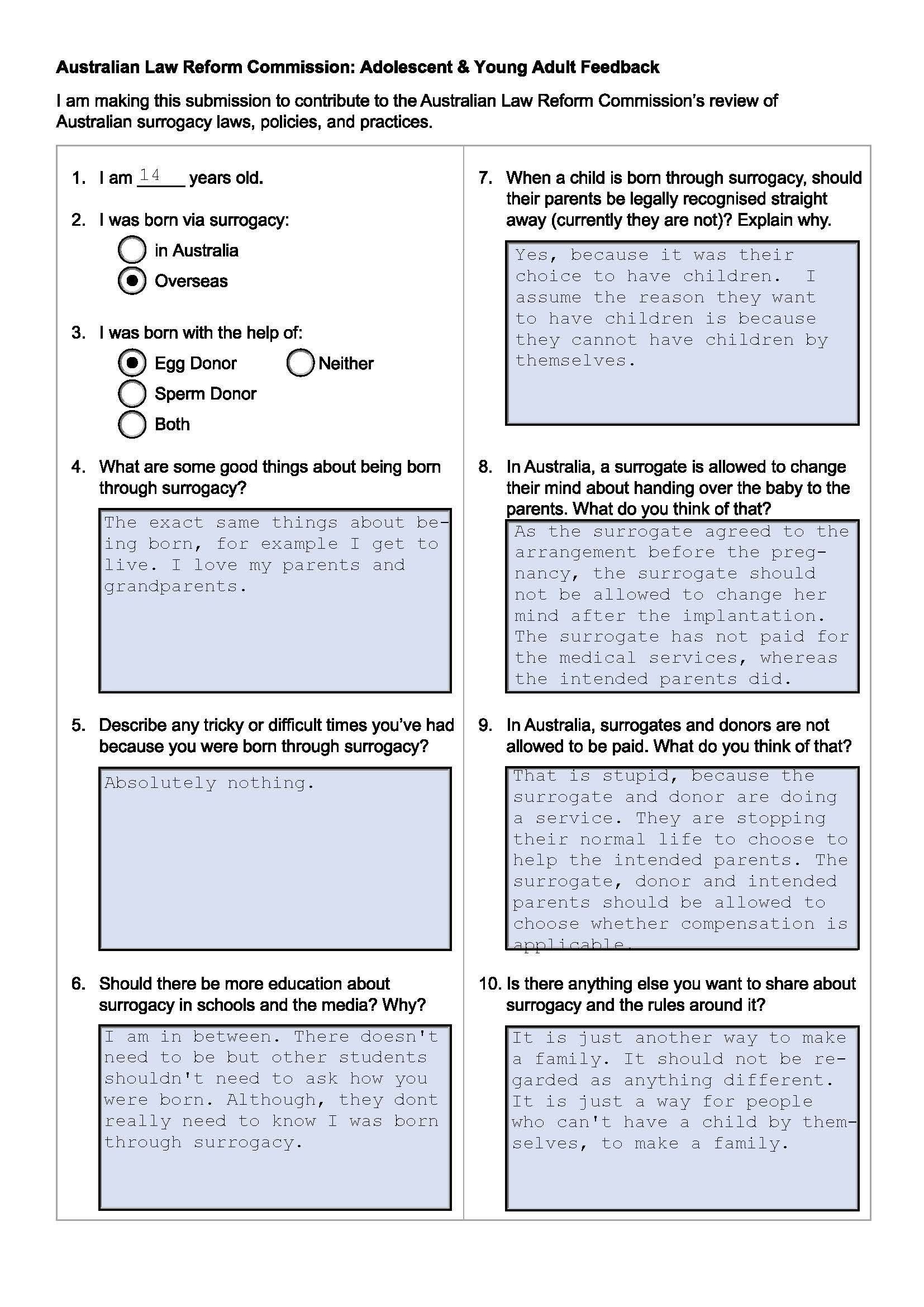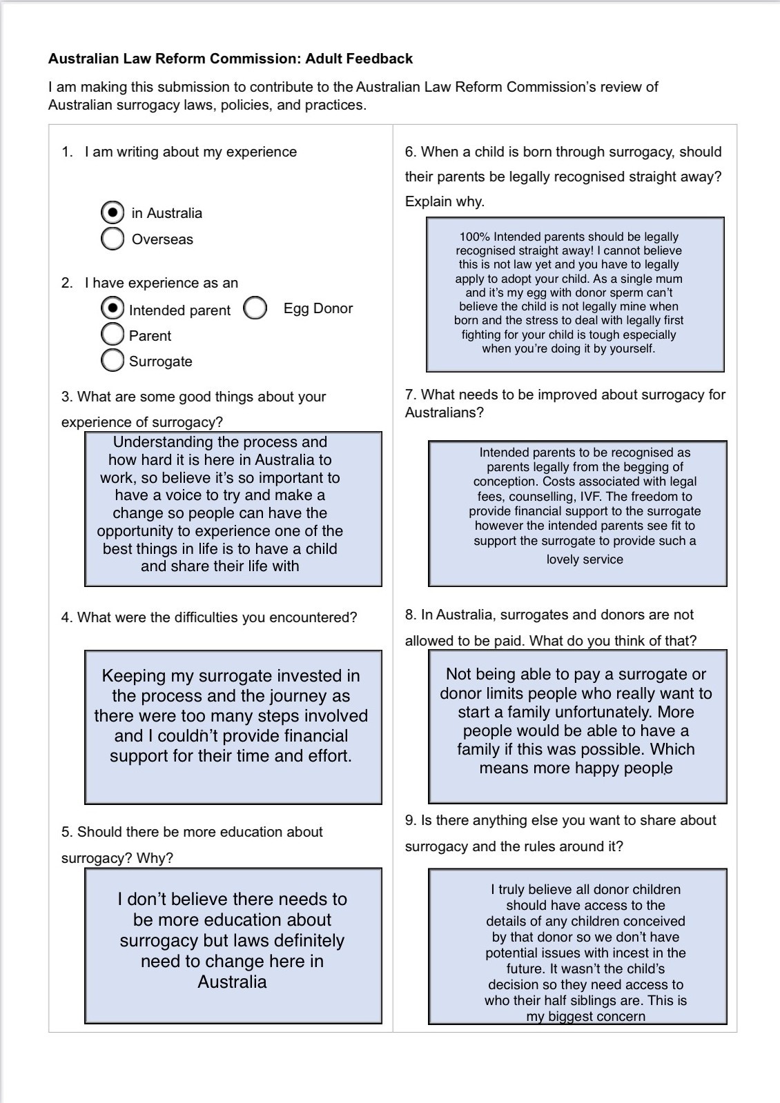The ALRC would like to thank everyone who made a submission to the Surrogacy Inquiry Issues Paper. We greatly appreciate hearing your experiences, views, and expertise.